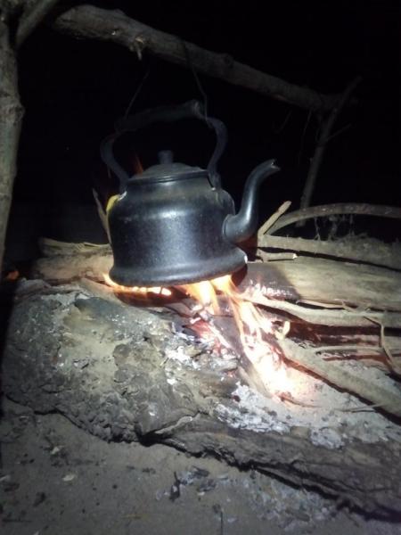 Поставили лагерь, натаскали дров на всю рыбалку сразу, разожгли костёр, повесили наш любимый алюминиевый чёрный от копоти чайник и пошли закидывать снасти.
