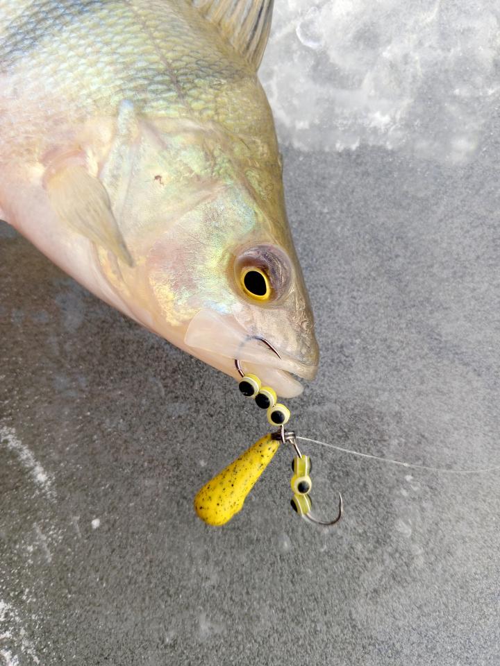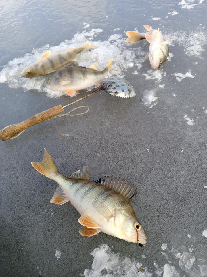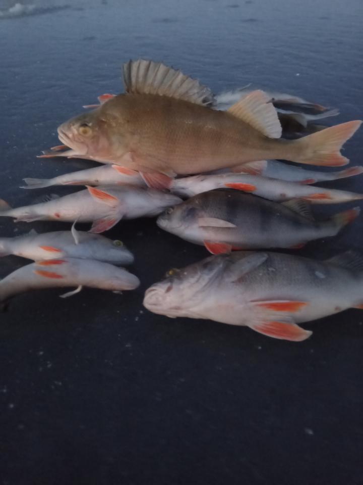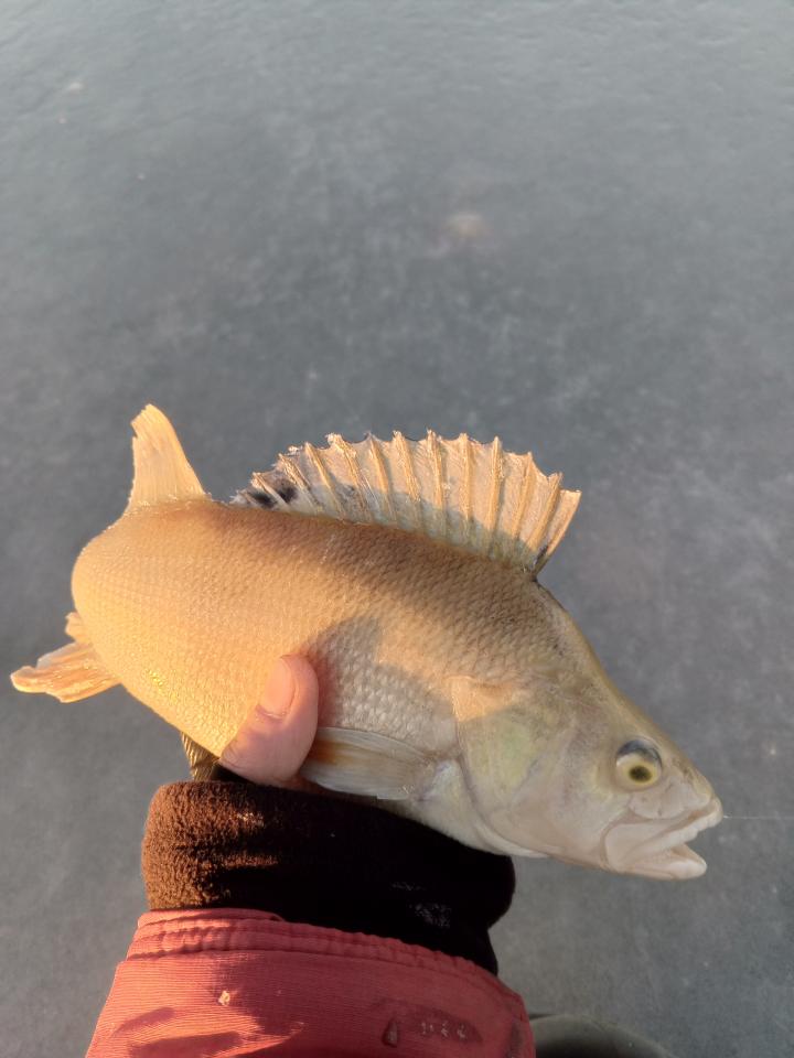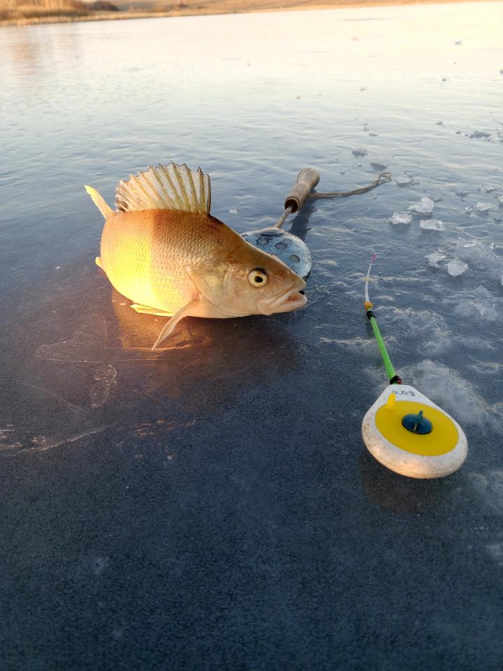 Под лункой мелькнуло желто-оранжевое пятно! Ну хоть не щука! Как только голова направилась в центр лунки я его схватил молниеносно! А на льду он выплюнул козу! Молодец, что не там, внизу!