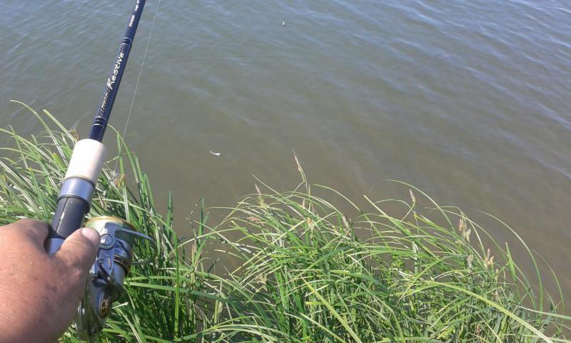 Немного успокоившись, продолжаю кидать спиннинг, на 4 или пятой проводке следует мощный удар!!! Спиннинг в дугу, фрикцион трещит, нет, даже подвизгивает... Кто то тяжелый на том конце лески тянет то вниз, то в сторону, мысли на раскоряку... Щука??? Сазан??? Давая широкие дуги по воде рыба показалась из воды - видна спина, яркие плавники - мама моя! Окунище!!! Я таких никогда не видел! А стоял на обрывистом берегу, подсака естественно нет, начал сдвигаться вправо с целью подвести на берег поположе... Да еще телефон в руке, заснять хотел, ...удак. Но здесь фортуна повернулась задом, дал слабину, почти у берега последовал рывок и вот результат... Успел заснять сорвавшегося окуня и выпавший от обиды из рук спиннинг...