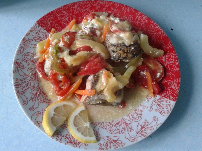 На противень сначала выкладываем часть овощей (помидоры свежие), потом щуку и сверху опять овощи и помидоры. Сверху сметана смешанная с майонезом 2:1. В духовку 180 градусов минут на 40.....