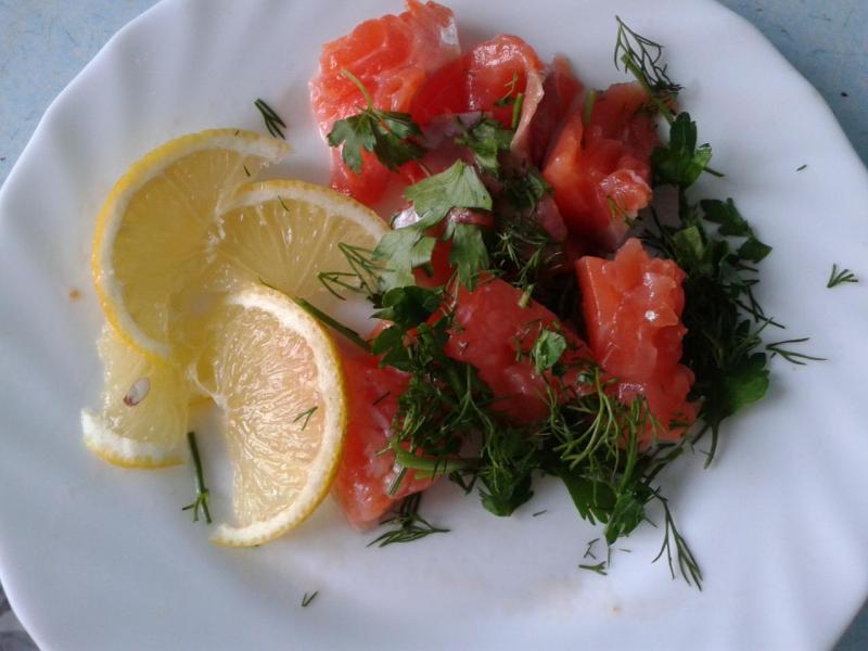Режем рыбу, заливаем тузлуком на 45-60 мин, и всё, готово!