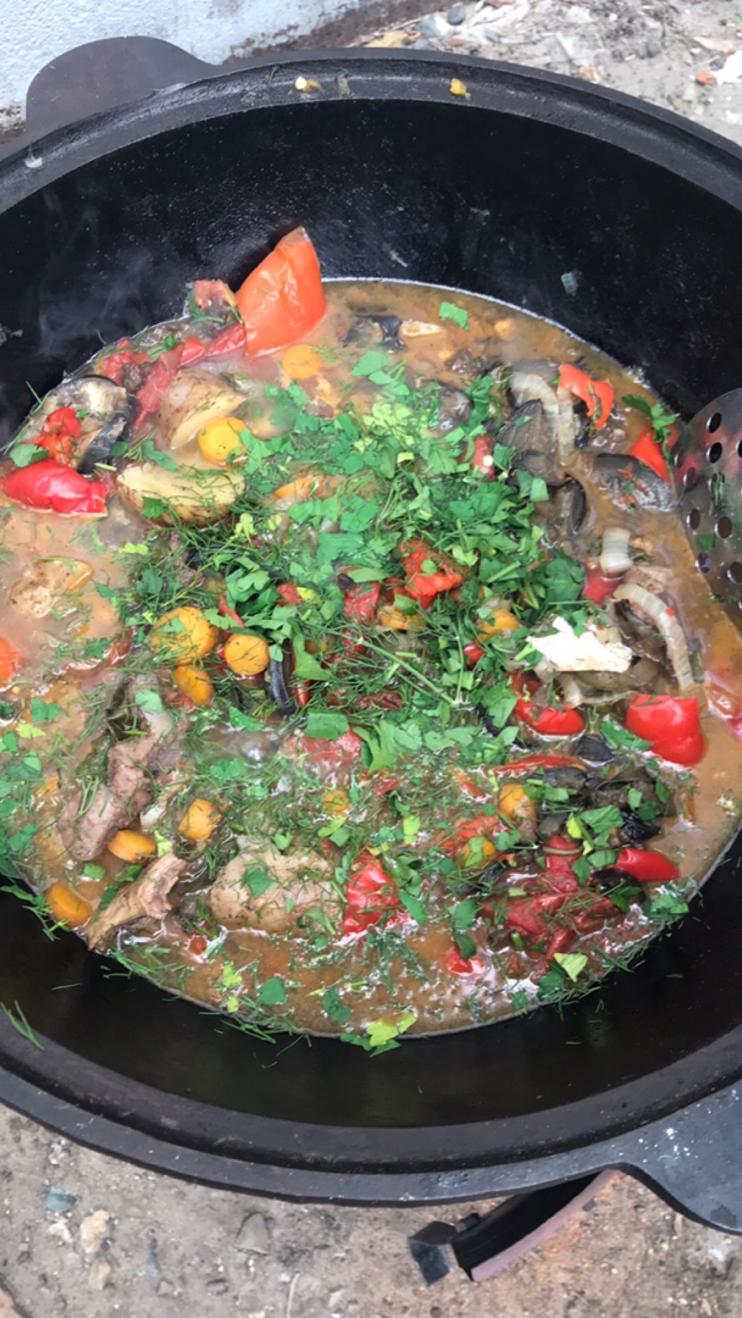 Говядина или баранина 2кг Пиво 1 л до 4 оборотов Картошка 1-1.5кг Морковь 2 шт Болгарский перец 1кг Помидоры 1кг Баклажаны 1 кг Лук 1 кг Перец острый стручковый 1-3 шт шт Базилик ,кориандр молотый,зира молотая по вкусу Соль по вкусу Перец черный мол...