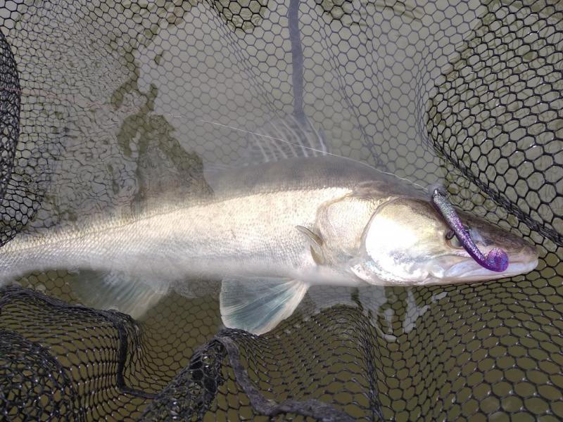 Ставлю опять сиреневого «басика» и на первой проводке поклёвка. Рыба также тяжело поддаётся и давит в низ. Довожу до поверхности. Судак крупнее первого. Подвожу под него подсак, и тут приманка вылетает из пасти, и он медленно переваливает через обод подсака и уходит, помахав хвостом. Хорош был, нечего не скажешь.