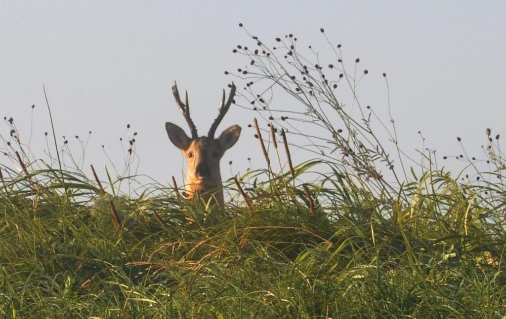 И опять я никого не поднял. Это меня начало настораживать ещё больше, уже меньше чем через сутки открытие, а утки нет. И преодолев небольшую болотину вброд, произошла неожиданная, удивительная встреча. Как только я вышел из болотца на сухую землю, в камыше в 15-20 метрах от меня заметил шуршание. И через несколько секунд просто оболдел. Из камыша на меня смотрела косуля. Какой же это красавец - морда, рожки, длинная шея, взгляд. Меня переполняли эмоции, так близко друг на друга мы ещё не смотрели.