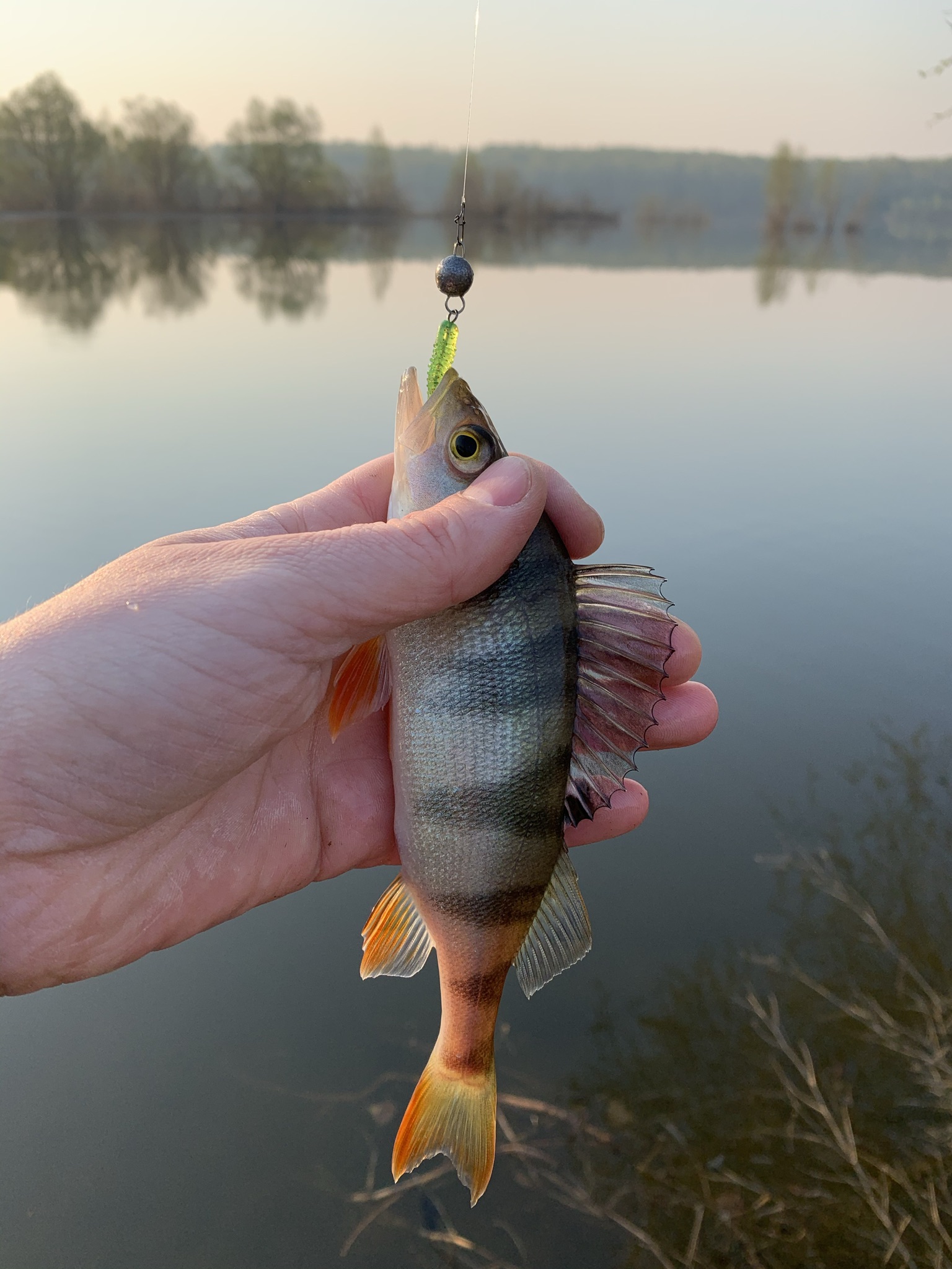 Окунь ещё очень вялый. Каждого приходится уговаривать сменой проводок, приманок, волшебным словом, но мал по малу окуньки попадали в мой садок.