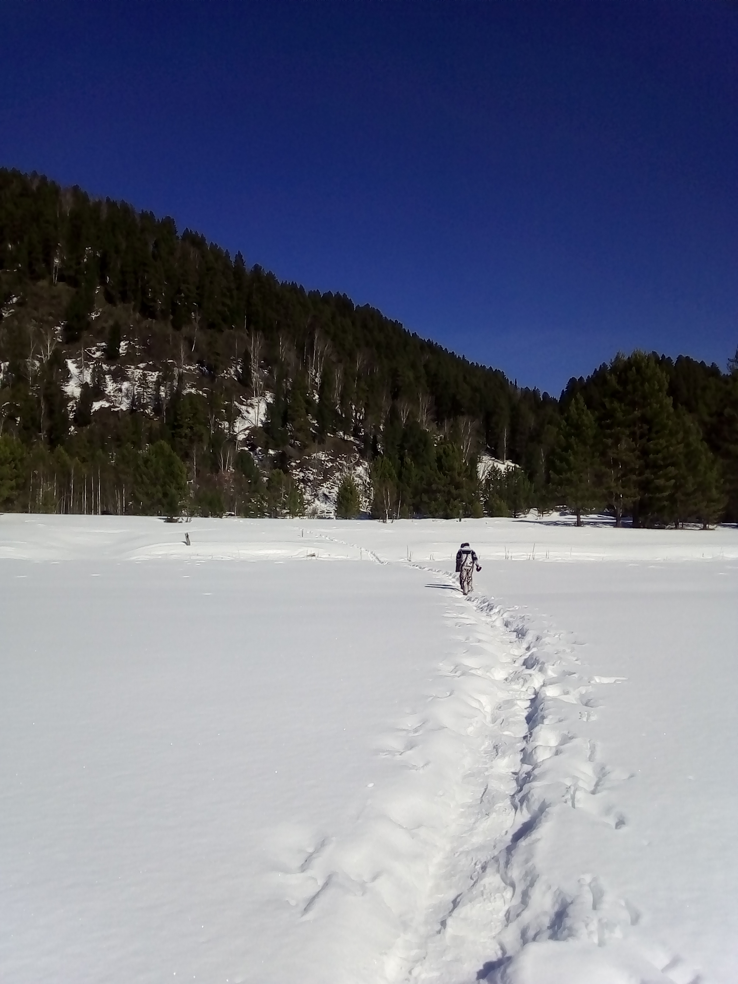 Мы с улыбками на лицах, довольные ступили на опасный лёд Бии. Ни разу до этого не видел, чтобы полутораметровый лёд стоял не на воде, а над ней!!! А там было именно так. Но это были не все сюрпризы. Мы охренели просто от их способа очищения лунки от шуги. Рыболовы вместе с бурами таскают за собой 10 метровые стволы елей или каких-то других хвойных пород. После бурения лунки нужно этим стволом продавить 2-5 метровый слой шуги подо льдом!!! И только потом можно опускать снасть. Пришлось и нам принаравливаться.