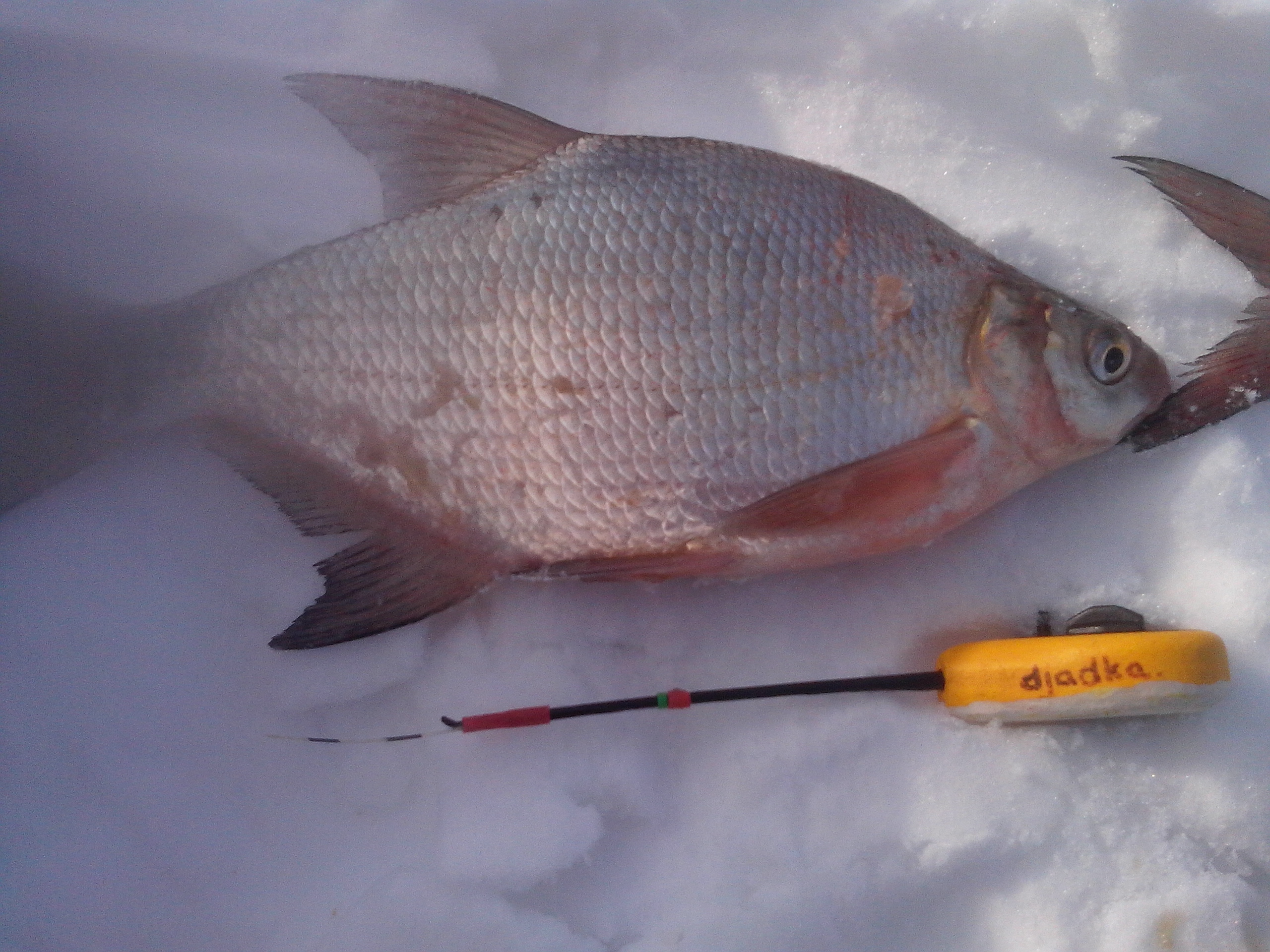 Возвращаюсь к компаньонам. Лунки молчат. Решаю испить кофейку, в процессе Костя говорит, что поймал подлещика с лунки кормленной сыпухой, и были ещё тычки, но реализовать не смог. Кофе в сторону, сажусь на эту заветную лунку и с ходу достаю двух подлещей около 200 грамм каждый, третьего сливаю.