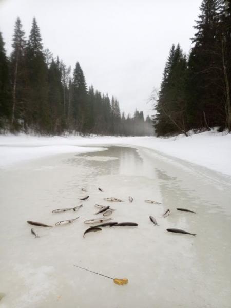 Среднее фото, на голом льду узкой речки - харюза?