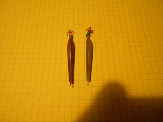 Добавляю в ассортимент. Гвоздик, маропедки различного размера (на фото 40 мм и 45 мм), листик 35 мм, клоп 30 мм. Разловил все. Маропедки переделал разных пропорций, больше всего понравились как на фото. Пропорции как у блесны Матвейчикова.