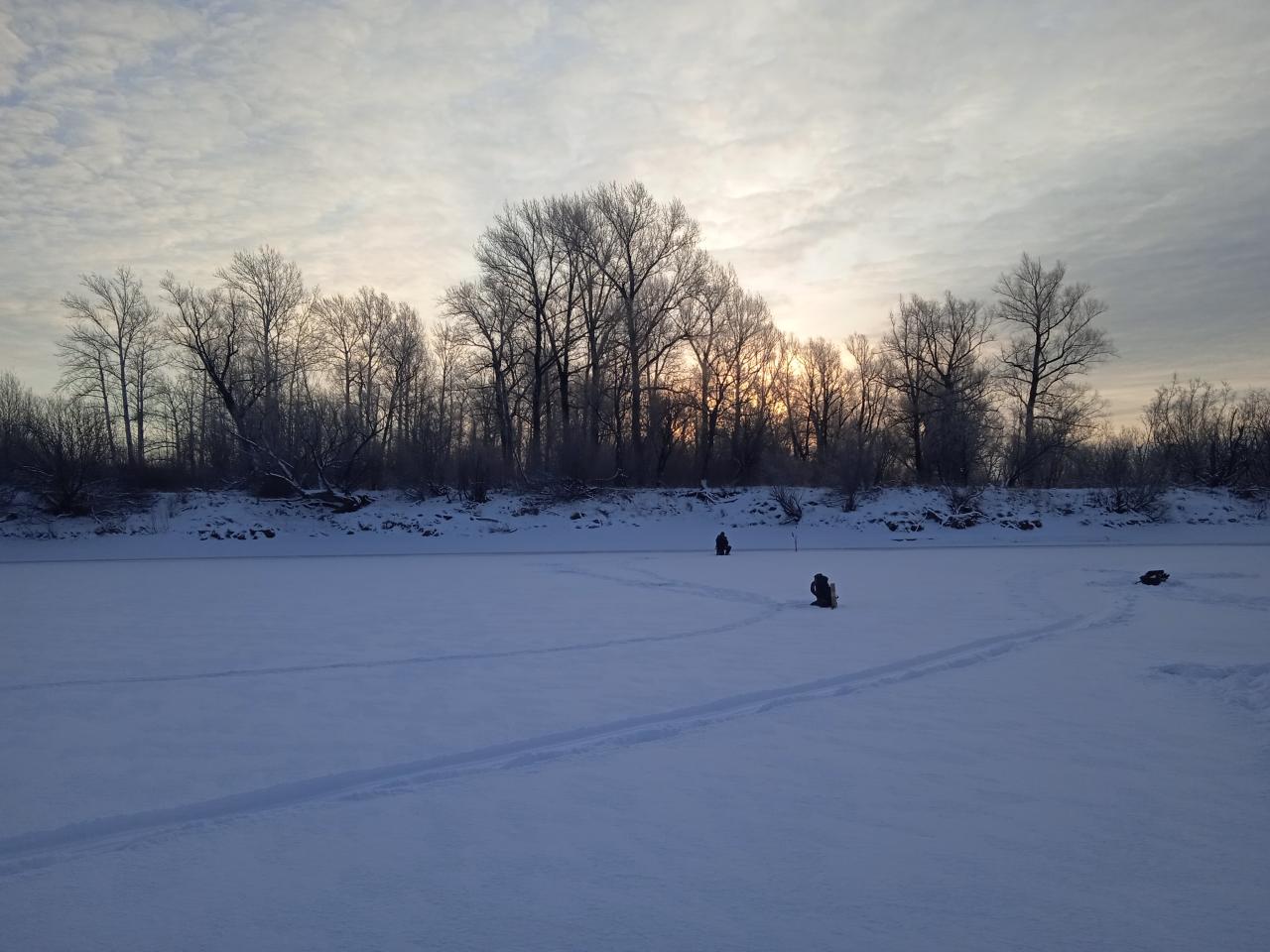 Марш-бросок по пухляку. Ещё протока рядом с городом. Забереги. Шли за крупным хищником. Не нашли, коряжки и глубины есть. На мормышку всё подряд,но с мотылем. После обеда добавил ещё три окуня к сфотанным. Окунь с метра. Двух хороших упустил, передний крюк зацепился за край лунки.