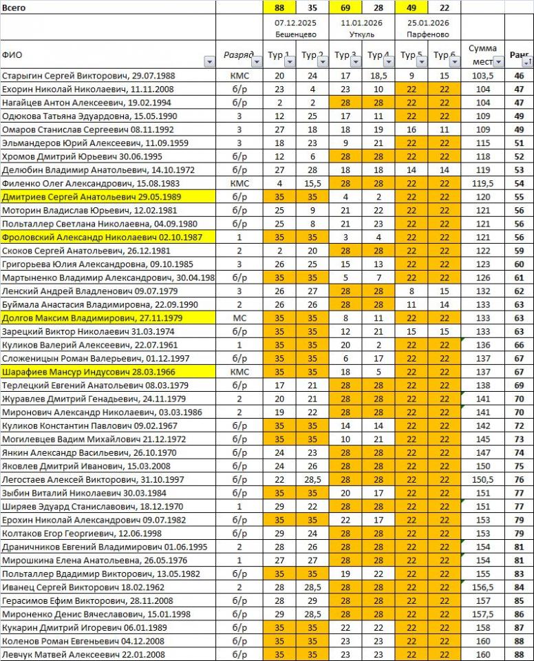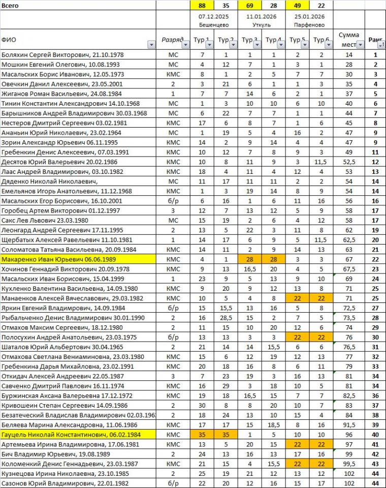В случае пропуска любого из туров спортсмену автоматически присуждается «последнее место в туре+5» (последнее место в туре выбирается из максимальной по численности зоне). Рейтинг после каждого рейтингового соревнования первого этапа обновляется и публикуется на интернет-сайтах.