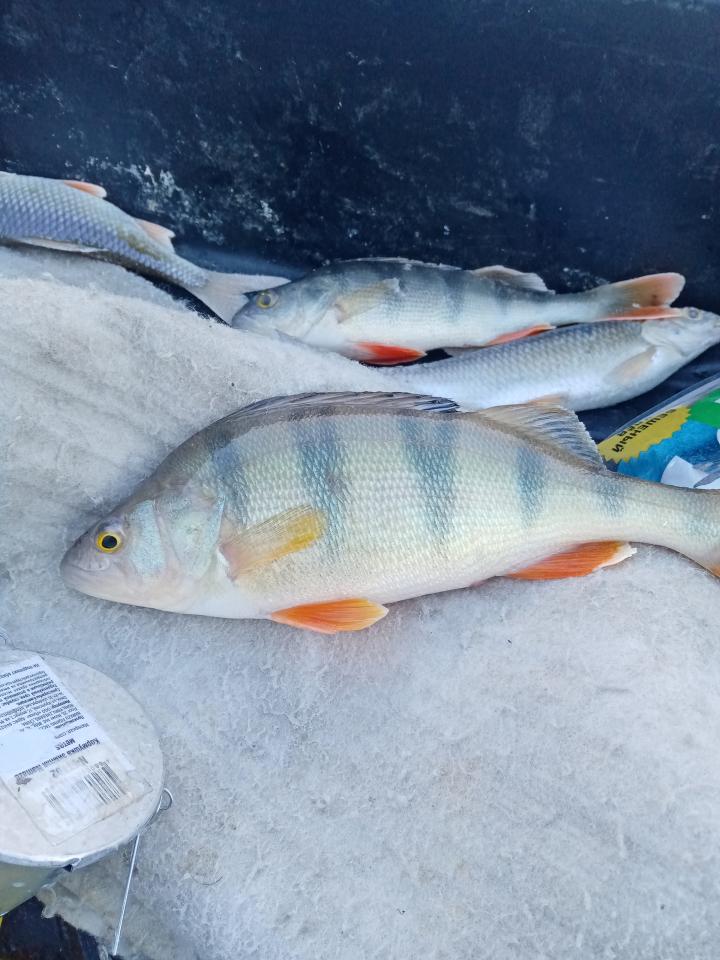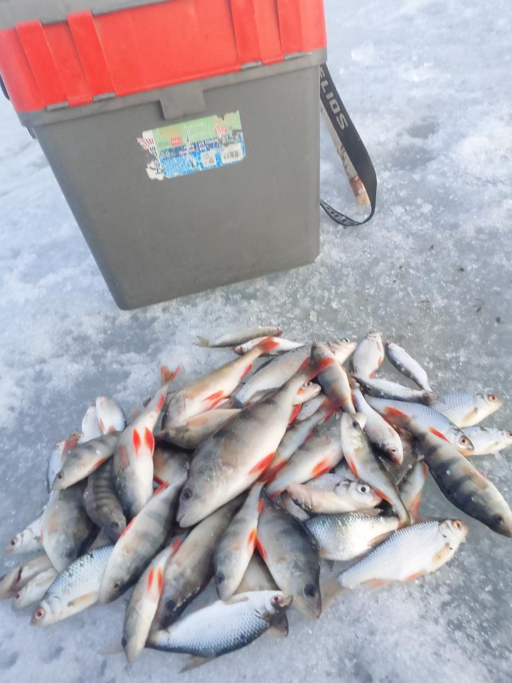 Пока обедали, часа полтора клева не было, добавил еще несколько лунок. И клев продолжился, До обеда уже полный пакет, окуней всего пять штук, но крупных. Погода плохая, ветер, пасмурно, туман, а рыбе видимо кайф, хотя ловили не все.